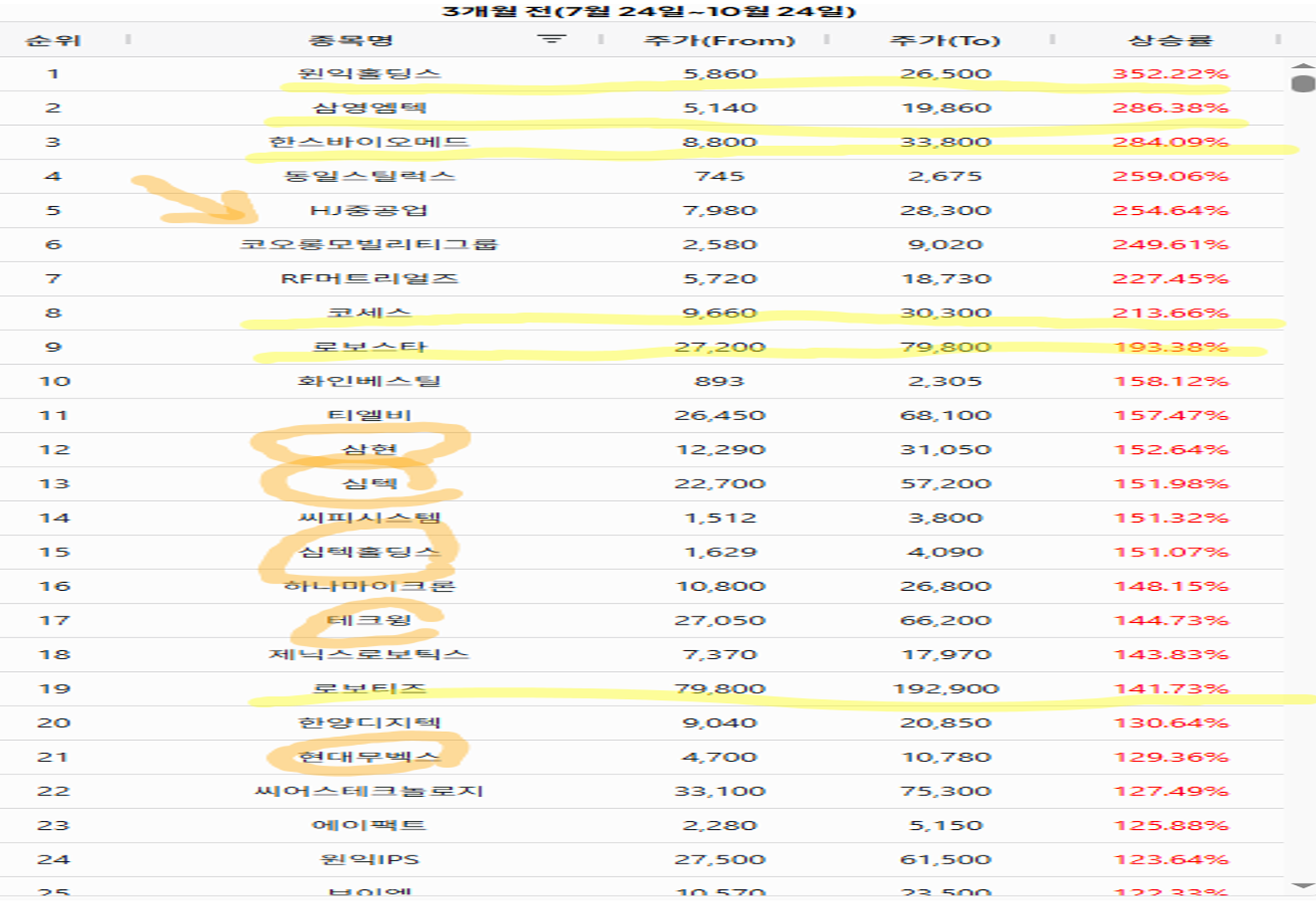 최근 3개월간 가장 많이 오른 종목에서도 AI 패스트가 잡아 요리한 종목이 단연 두각을 나타내고 있습니다 .