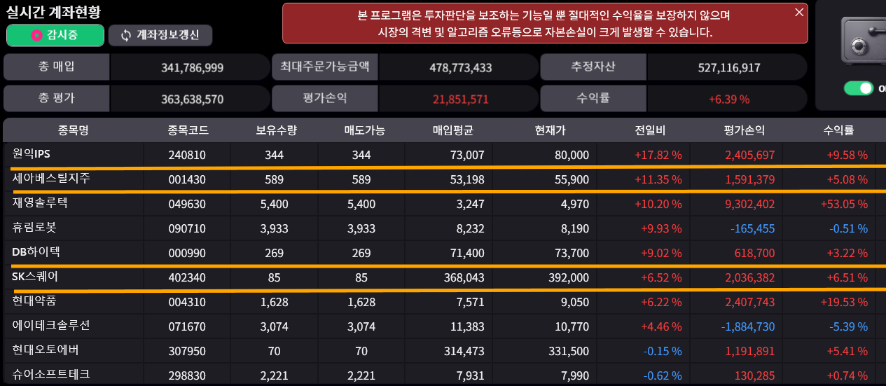 가동 5일 차, AITS의 계좌에는 **재영솔루텍 +53.05%,