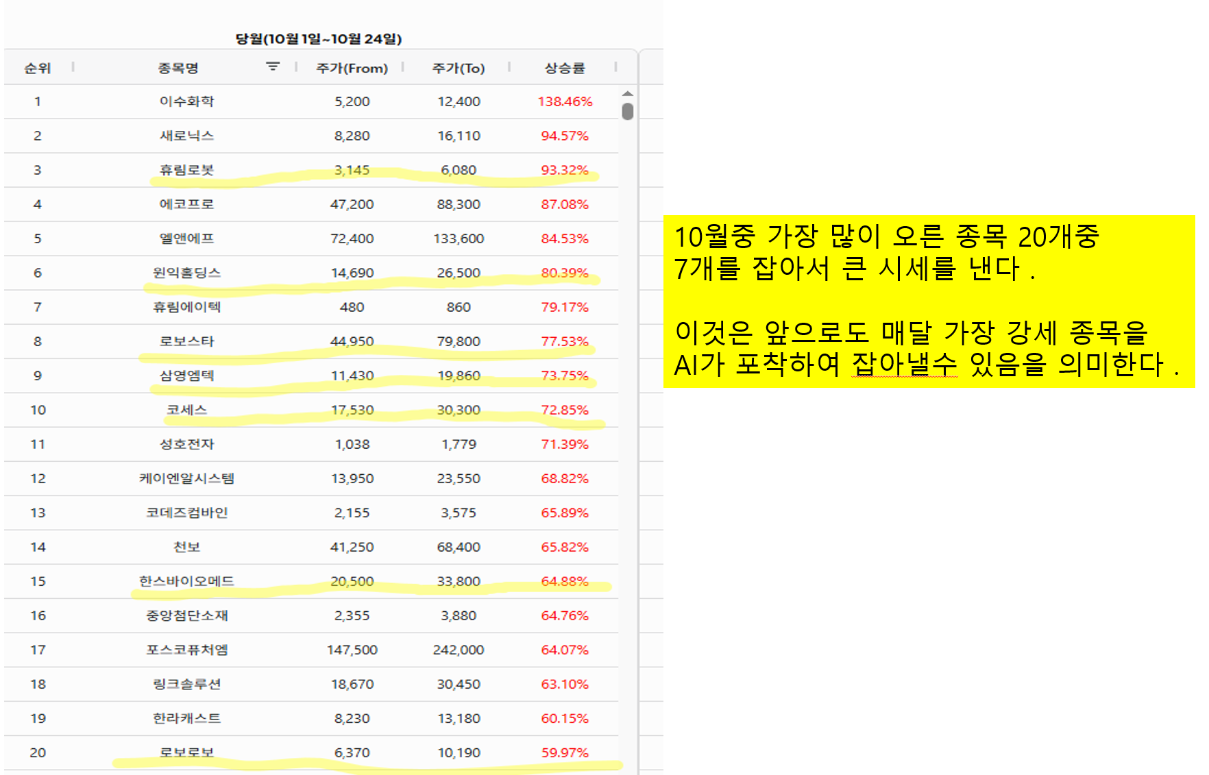 AI 패스트 가동 15일만에 10월달 가장 많이 오른 종목 20개중 7개를 잡아 큰 시세를 냈습니다 .