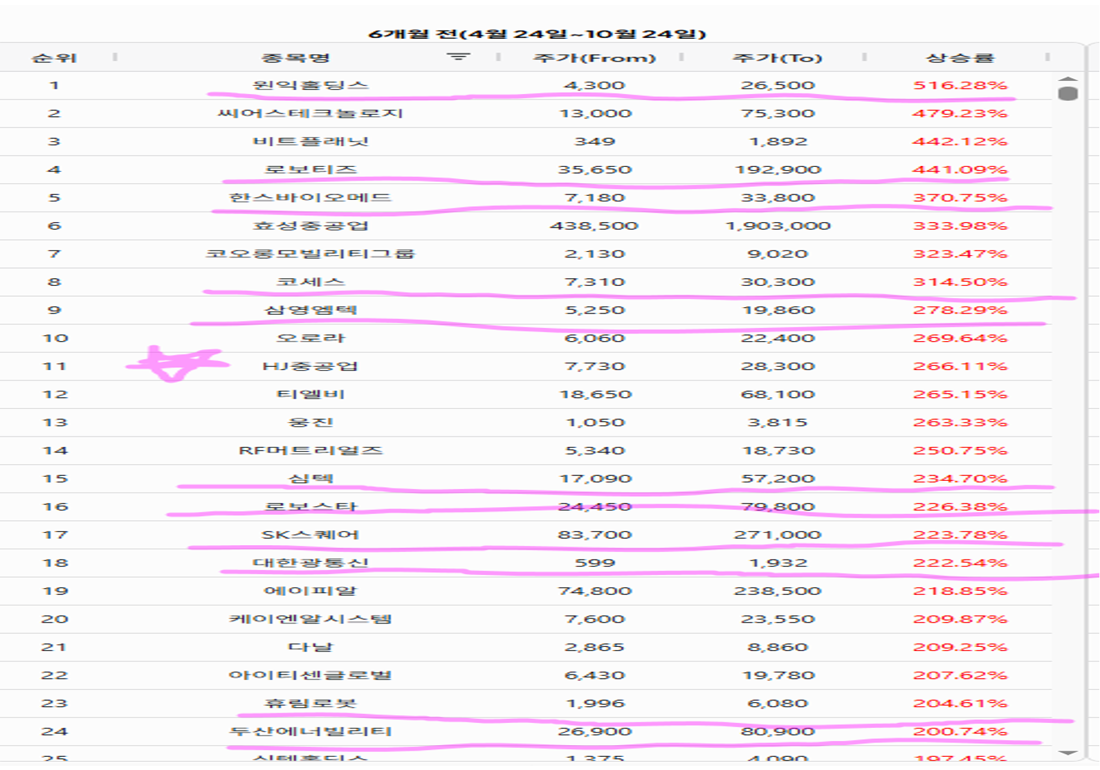 최근 6개월간 가장 많이 오른 종목군도 역시 AI 패스트가 잡아내 수익낸 종목과 일치합니다 .