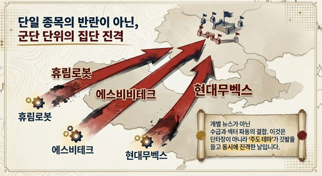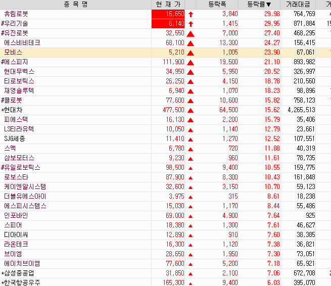 휴림로봇. 우리기술. 유진로봇. 에스비비테크. 모비스. 에스피지. 현대무벡스가 폭등 !!