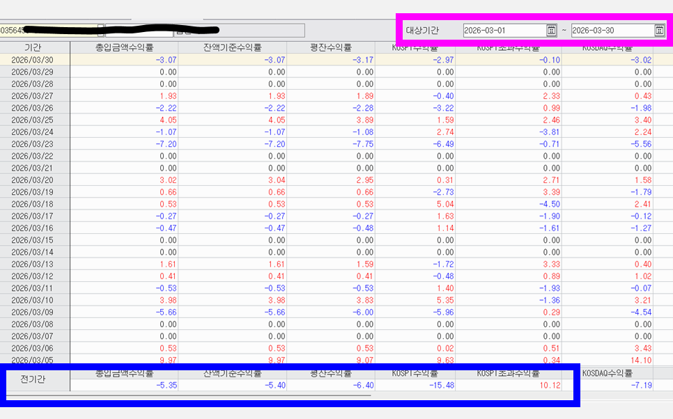 2026년 3월 /한달간 수익율 -5.35% ( 시장 하락율 -15% 대비 매우 선방 )